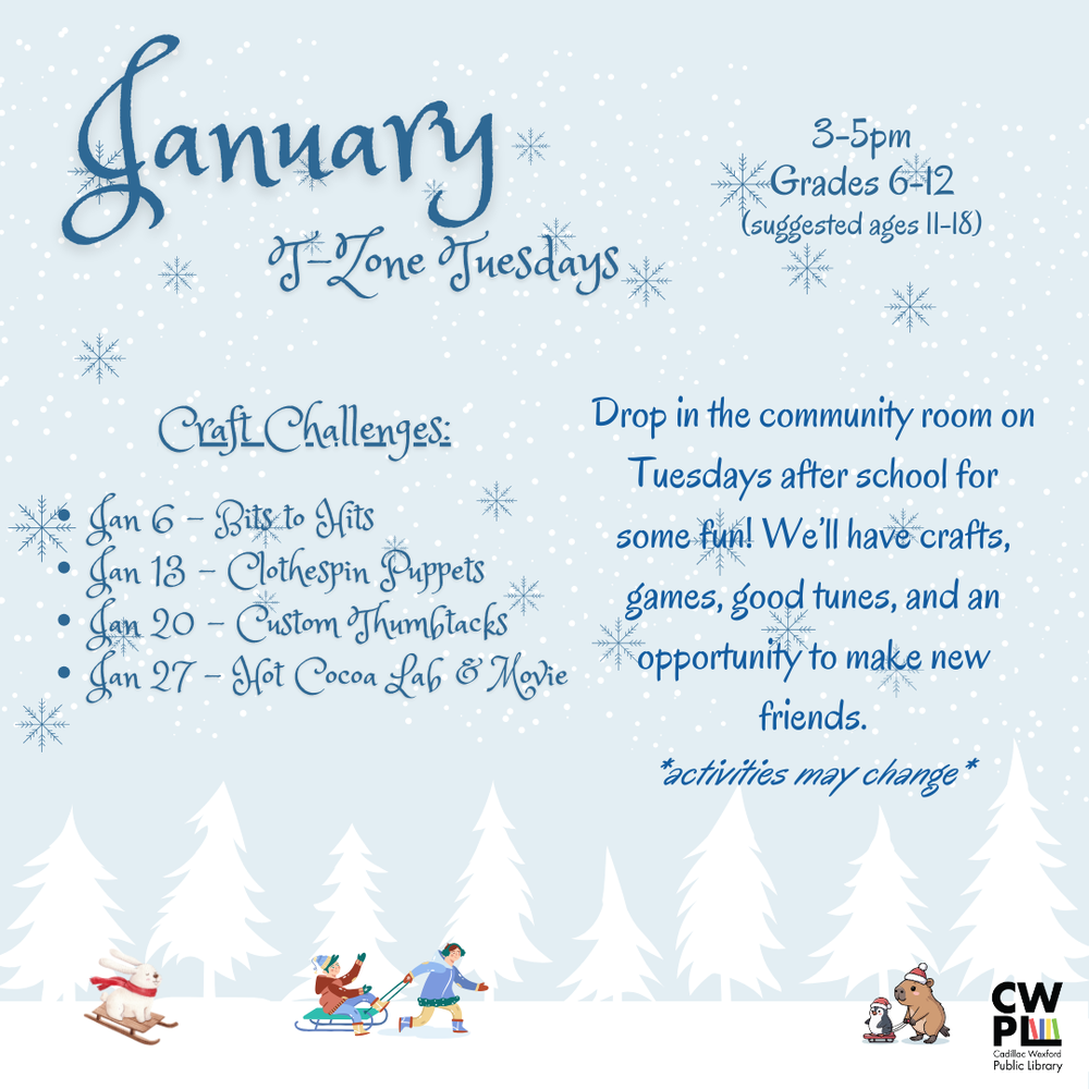 Drop in the community room on Tuesdays after school for some fun! We’ll have crafts, games, good tunes, and an opportunity to make new friends.